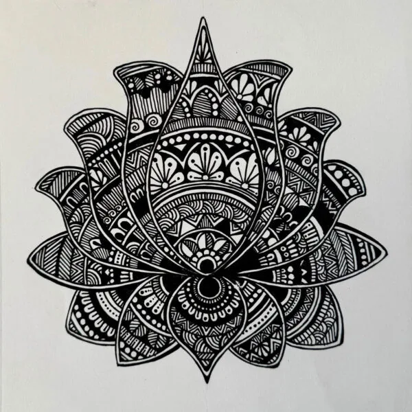 This one-of-a-kind artwork by 11-year-old artist Vaiga features a delicate lotus silhouette, beautifully filled with intricate mandala patterns.
