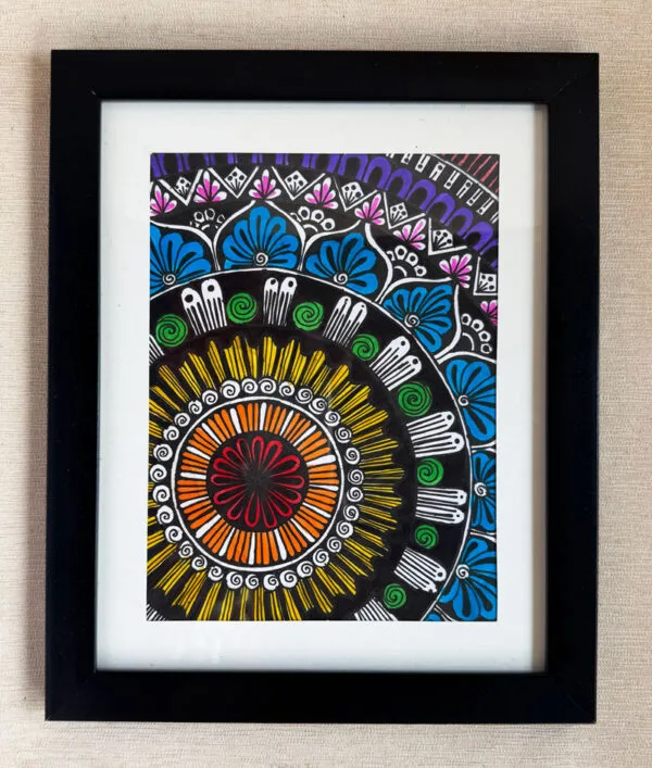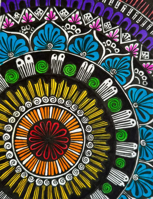 Inspired by the magic of a rainbow, this vibrant piece by 11-year-old Vaiga is a whirlwind of bold black-and-white ink swirls, all brought to life with a rainbow of colors that’ll make your walls pop!